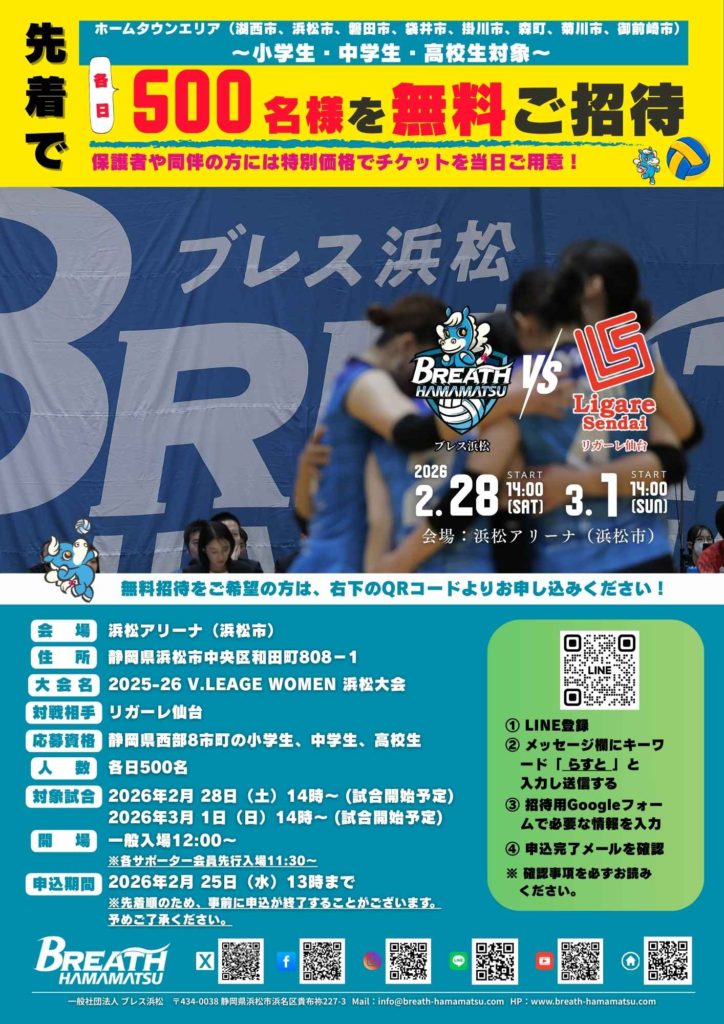 2026年2月28日(土)、3月1日(日)のブレス浜松のホームゲーム第6戦に、連携協定を結んでいる7市1町の小学生、中学生、高校生のみなさま、各日500名様を無料でご招待します。