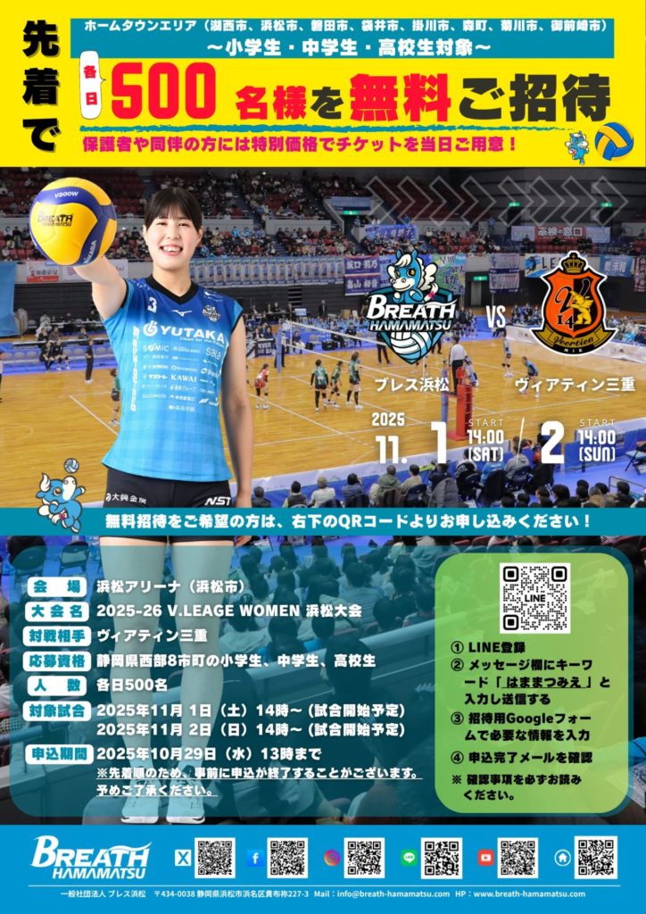 【お知らせ】2025‐26ブレス浜松ホームゲーム第2戦に静岡県西部8市町の高校生以下無料ご招待!!