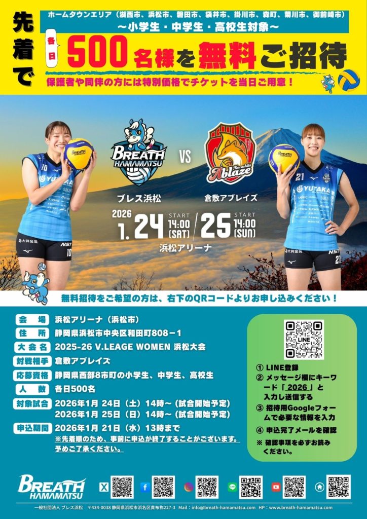 2026年1月24日(土)、25日(日)のブレス浜松のホームゲーム第6戦に、連携協定を結んでいる7市1町の小学生、中学生、高校生のみなさま、各日500名様を無料でご招待します。