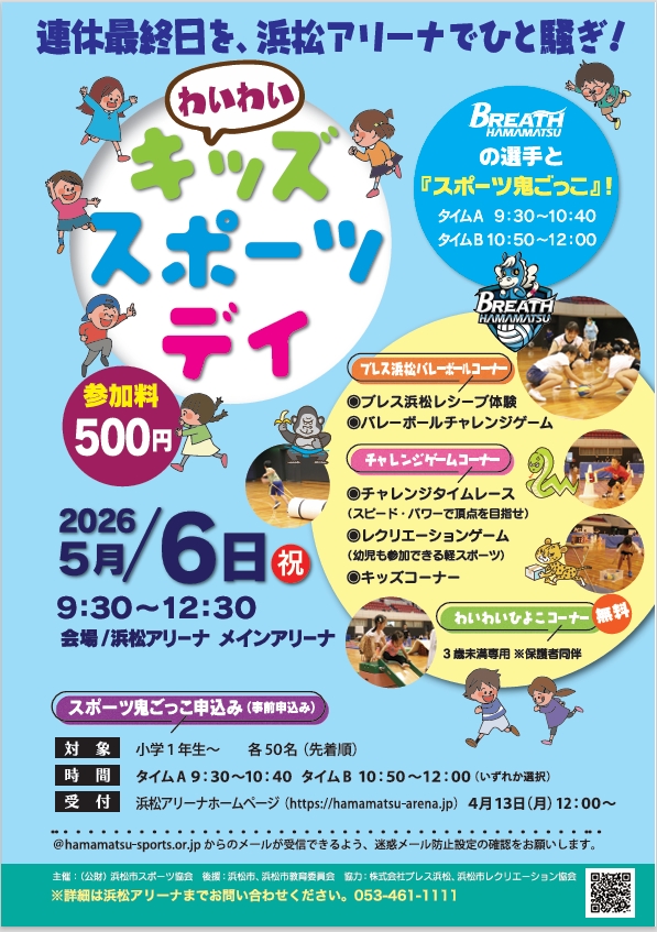 5月6日(水)に浜松アリーナで開催される、「わいわいキッズスポーツデイ」に参加いたします。