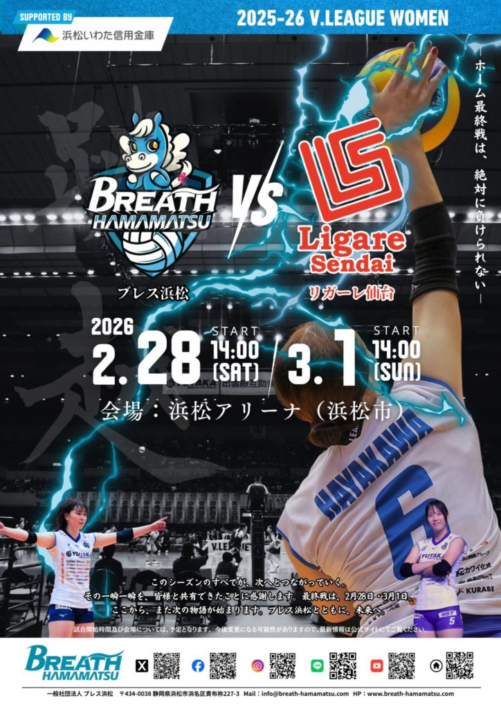 【ホームゲーム情報】2月28日(土)、3月1日(日) vs.リガーレ仙台 supported by 浜松いわた信用金庫