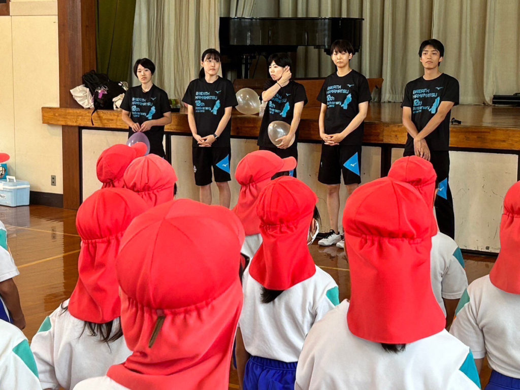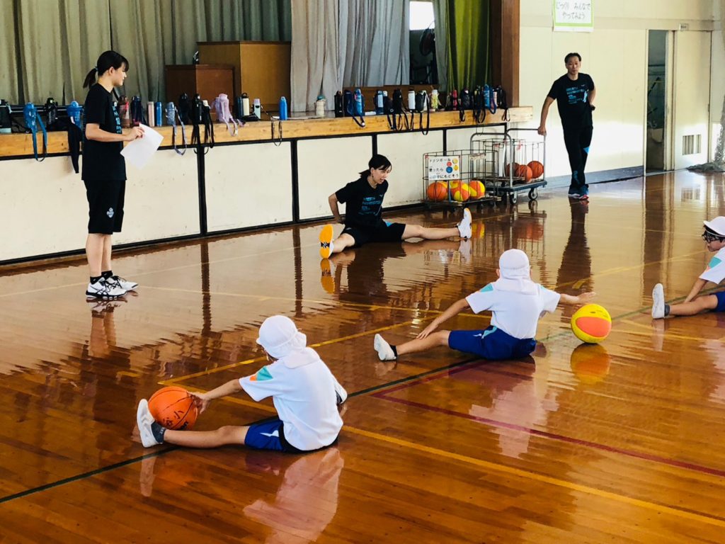 9/22(金)に#2 栗栖明歩(くりすあきほ)・#7 浅野奈菜(あさのなな)・#8 大谷瑞季(おおたにみずき)・#16 畠山初音(はたけやまはつね)が訪問し、4年生を対象にボールを使った体力トレーニングにおける模範演技実演を行いました。